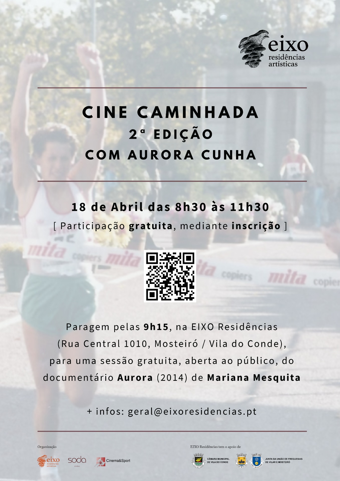 Durante a CINE CAMINHADA, pelas 9h15 horas, iremos fazer uma paragem na EIXO Residências Artísticas (Rua Central 1010, Mosteiró / Vila do Conde), para uma sessão aberta ao público, gratuita, do documentário "Aurora" (2014) de Mariana Mesquita. Uma sessão dedicada ao percurso da tricampeã mundial de estrada, vencedora de 4 maratonas e uma das embaixadoras da Ética no Desporto.